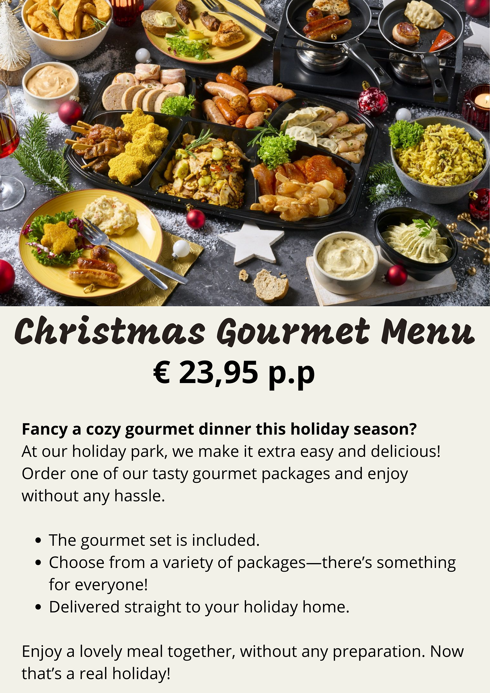 At our holiday park, you can easily order barbecue and gourmet packages. The barbecue or gourmet set is provided, so you can enjoy without any hassle. There are various packages available, so there's something for everyone! Order before 12:00 PM, one day in advance, and your order will be delivered to your holiday home the following day.